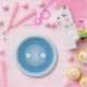 Diese Papiertafel ist mit einem benutzerdefinierten Set aus kreisförmigem Text verziert, das mit einem hellblauen Schaltflächensystem koordiniert wird, das mit den Elementen, die meine Tasten und das Nähmuster der Nadeln enthalten, übereinstimmt.