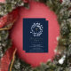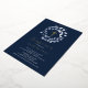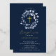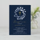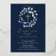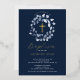 Schöne Gold Foil Taufen Einladungen mit einem weichen, blauen Blattkranz und Set auf einem dunkelmarineblauen Hintergrund. Dreh unsere Einladung, um einen koordinierenden Rücken für eine besondere Touch zu sehen. Besuchen Sie unseren Shop und sehen Sie sich unsere gesamte Blattsammlung an.