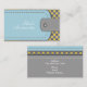 Blauer und grauer Leder-Look und Muster gelben modernen Accessoires Visitenkartenvorlage mit einem hellblauen und grauen Band mit Nähten und einem Knopf im Lederstil - nicht echtes Leder, nur ein PRINTED Bild und geometrisches Muster in Grau und Gelb.