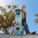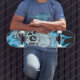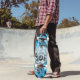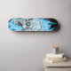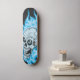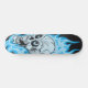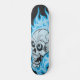 Der lustige Schädel, der durch blaue Flammen umgeben wird, ist ein bunter Schädel, der auf Skateboards groß schaut.