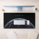 Eine Schreibtischmatte zeigt den Planeten Erde auch als blauer Marmor im Weltraum. Das Wort "Erde" kann durch jedes andere Wort ersetzt werden. Zum Beispiel Ihr Name oder ein Datum.