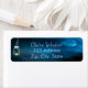 Eine dunkelblaue Nacht mit Vollmond und dramatischen dunklen Wolken. Dekoriert mit einem bemalten Glaskeramikgefäß mit einer glänzenden Kerze. Vorlage für Namen und Anschrift, hellblaue Buchstaben.