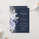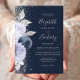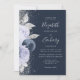 Die links Seite dieses eleganten, modernen Hochzeitseinladens besticht durch einen Blumenstrauß in marineblau-blauen und blasslila Tönen, bestickt mit silberner Imitat-Folie und Imitaten Glitzer-Blattwerk und mit silberfarbenem Imitat-Glitzer bestreut. Der anpassbare Text kombiniert silbergraue Handschrift, Copperplate und kursiv Schriftart auf marineblau Hintergrund. Die Rückseite weist ein passendes Blumendesign auf.
