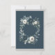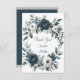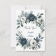 Hochzeitsfeier mit einem blumengeschmückten, marineblauen Kranz in Aquarelltönen mit üppigen Rose und Eukalyptuspflanzen in Marineblau, Grün und Elfenbein. Das Design wird durch eine silbergraue Druckbox unter dem Kranz mit modernem Schriftart-Textlayout ergänzt. Die Rückseite der Einladung setzt das Thema mit einem passenden Blumenarrangement für einen einheitlichen und eleganten Look fort. Ideal für Paare, die eine zeitlose und elegante Hochzeitsreise suchen.