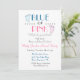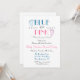 Moderne und elegante Blu oder Pink Gender Reveal Einladung. Weiß laden mit rosa, blau und grau Schrift ein, die sagt, Blau oder Rosa, Was denken Sie? Das Design zeichnet sich durch einen rosa und einen blauen Babyfußabdruck aus.