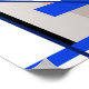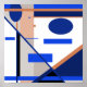 Kürzen Sie auf Standardrahmen oder Ihre eigene Vorliebe (in kleinen bis großen Größen von verschiedenen Proportionen und verschiedenen Papiertypen erhältlich). Angezeigt wird ein abstraktes Design von fett-geometrischen Formen in Blautönen von königlich bis navy, leicht und gedämpft orange, schwarz und warm grau, alles auf einem weißen Hintergrund, inspiriert durch den modernen Design-Stil der Mitte-Jahrhunderts.