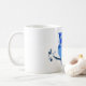 Tasse hat ein blaues monochromatisches Design einer Eule auf einem Zweig mit Blätter.