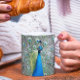 Genießen Sie Ihr Lieblings-Heiß- oder Kaltgetränk in dieser Keramik Kaffee-Tasse, die ein atemberaubendes Foto von einem wunderschönen, blauen Pfau mit farbenfrohen Federabwurf bietet. Wählen Sie Ihre Tasse Stil und Farbe. Das Bild umschließt die Tasse.