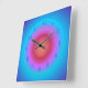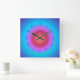 Ein stimmungsvolles blau/aqua kreisförmiges Design mit einem Glüheffekt. Die Mitte der Uhr hat rosa und pfirsichfarben. Diese trendige Uhr hat dunkelblaue Ziffern. Die Anpassung ändert die Form in eine Rundung. Die Hände sind auch in Silber erhältlich. Bitte beachten Sie: Dies ist nicht nur ein bedrucktes Produktdesign.