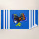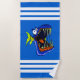 Ein lebendiges, blau gestreiftes Strandtuch mit einem bunten, spitzen, spitzen Zahnpiranha-Fisch in der Mitte.