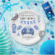 Race Car Thema Baby Dusche Einladungskarte mit Aquarellbildern eines blauen Rennwagens.