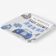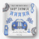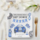 Race Car Thema Baby Dusche Einladungskarte mit Aquarellbildern eines blauen Rennwagens.
