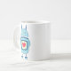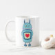 Blaue Roboter-Tasse mit einer Cartoonillustration eines blauen unbeholfenen Cartoonroboters, der eine Platte mit einem Herzen hält. Diese niedliche Tasse ist für Kinder und Geeks passend, die Lieberoboter und niedliche Illustrationen.
