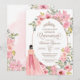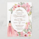 Quinceañera Einladung mit Blume in Rosa Blush und einem Mädchen in einem schönen passenden Kleid. Karo den Shop für diese Einladung mit Mädchen in verschiedenen Haarfarben und Hautfarben und mehr Variationen.