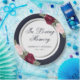 Elegante blaue Aquarelltafel mit blumengeschmückten Gedenktafeln und Beerdigungstafeln mit bordeauxroten und rosa Rosen und Baby's Atem Blume. Matching-Elemente verfügbar.