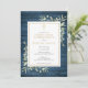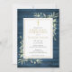 Mit zarten Aquarellgrün-Blätter auf blauem rustikalem Holzfußboden und einem eleganten Goldkruzifix ist diese erste heilige Kommunion-Einladung personalisiert mit Ihren speziellen Informationen. Entwickelt von Thisisnotme©