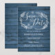 Mit feinen Blumenbildern auf blauem rustikalem Holzhintergrund. Personalisieren Sie Ihre speziellen Save the Date Informationen. Entwickelt von Thisisnotme©