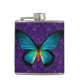 Blauer Schmetterling auf Lila Glitzer Flachmann