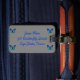 Schöne blaue Schmetterlinge auf einem silbernen Hintergrund für diesen Gepäckanhänger. fertigen Sie ihn besonders an, um ihn für Sie gerade nach rechts zu machen.