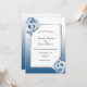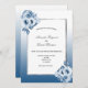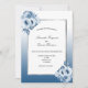 vorne: Klassischer blau-weißer Farbverlauf mit einem silbernen Rahmen für Imitate. Die Blumen sind mit Blume in Aquarelltönen geschmückt. Vorlagen für die Namen der Braut und des Bräutigams und Einzelheiten zum Party. Die Namen sind mit einem modernen handgeschriebenen Stilskript, blauen Buchstaben geschrieben. Zurück: klassischer blauer Farbverlauf.