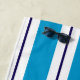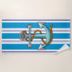Blaues und weißes gestreiftes Strandtuch mit einem blauen Anker in der Mitte, um ein Gefühl von Wassersport zu geben.