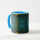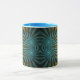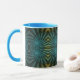 Kaffee Tasse mit "Blue Tango" ein abstraktes Design Copyright © 2009, Susan Wallace. Texturierte Ventilatoren in den Farben Blau und Grün wirl und Spirale zusammen, treffen sich in den Punkten von neonfarbenem hellem Licht. Volles Umwicklungsdesign.