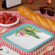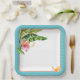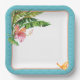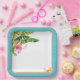 Diese viereckigen Teller mit blauen Rahmen, die ein weißes Zentrum umrahmen, verleihen dem Strand, dem Pool oder dem Party mit hawaiianischem Motiv einen eleganten Set. Ein rosa Rahmen hebt die hübschen Farbtöne der Blume des Hibiskus hervor, umgeben von dunkelgrünen Palmen-Blätter, die alle in Aquarellen gehalten sind.