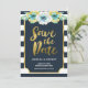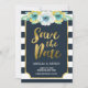 Dieses stilvolle Save the Date Invitation verfügt über eine goldene Imitat-Grenze, blau-weiße Streifen und schöne Aquarellblumen. Zur Einladung gehört auch eine gemusterte Rückseite. Karo andere passende Artikel in der Blue & White Kollektion, Imitate Gold, Blumenhochzeit / Bridal Collection in meinem Shop http://www.zazzle.com/collections/blue_white_faux_gold_floral_wedding_bridal-119799004172959353?rf=238364477188679314 Personalisieren Sie diese Einladung durch Ersetzen des Platzhaltertextes in der Vorlage. Für weitere Optionen, wie zum Beispiel den Schriftart zu ändern und seine Größe, klicken Sie auf die Schaltfläche "Anpassen". *Bitte beachten Sie, dass das Zazzle-Wasserzeichen in der Zoomvorschau NICHT auf dem gedruckten Endprodukt © Rosewood and Citrus erscheint