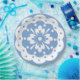 Geometrischer Rahmen und Blumenmitte in Weiß auf einem weichen blauen Hintergrund Die Hintergrundfarbe kann für ein anderes Aussehen geändert werden