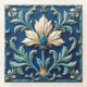 Eine quadratische Fliese mit symmetrischem Blumendesign in Blau-, Weiß- und Goldtönen, verzierte Details, komplizierte Muster, eleganter, königsblauer Hintergrund.