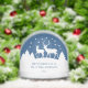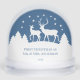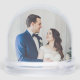 Ein Weihnachts-Schneekugel mit einem Foto von Braut und Bräutigam auf der einen Seite und einer Illustration und Text auf der anderen Seite.