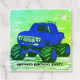 Die Abbildung erfasst den Power des blauen Monsterwagens, der durch zerklüftetes Gelände brüllt. Es ist ein Symbol für unaufhaltsame Energie und Aufregung,
