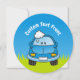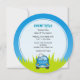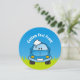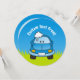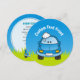 Ein blauer Cartoon mit Seifenblasen über grünem Gras unter blauem Himmel.