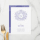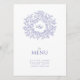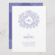 lila blauer und weißer Hochzeitsmenü. Bearbeiten Sie dieses 4-Gänge-Menü mit der eigenen Menüoption. Einfache, aber moderne handgezeichnete Blätter und Monogramm-Design. © Original Hand botanisches zeichn und Design von Sarah Trett für www.mylittleedenweddings.com exklusiv auf zazzle.