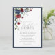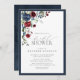 Moderne, elegante Braudusche mit einem Bouquet marineblauer und bordeauxfarbener Blume, die von Marineblau gesäumt sind. Personalisieren Sie Ihre Brautparty-Details in weichem Offschwarz, betont mit einer schönen modernen handgeschriebenen Kalligraphie. Die Rückseite der Karte weist eine marineblau blaue Aquarellstruktur auf. Kontaktieren Sie den Designer für passende Produkte oder Variationen. Copyright Elegant Invites, alle Rechte vorbehalten.