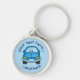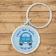 Lächelndes blaues Cartoon auf hellblauem Hintergrund. Zwei benutzerdefinierte Textfelder im Kreis.