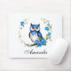 Eine Eule auf einem Zweig mit blauen Rose, die in sanften Aquarelltönen dargestellt wird.