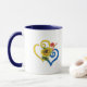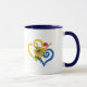 Dieses Design ist mit einem saphir blauen und gelben Paar verdrehter Herzen geschmückt, das mit einem goldenen und roten Blume-Bouquet geschmückt ist. Die Blume sind mit einer Sonnenblume und einigen wunderschönen roten Blume ausgestattet. Sie können Ihre Unterstützung der Ukraine mit den Nationalfarben der Ukraine und der Sonnenblume zeigen, die die ukrainische nationale Blume ist. Dieses Bild hat keine Hintergrundfarbe, daher hat es die schlichte Farbe der Tasse oder des Bechers.