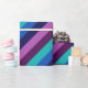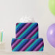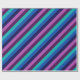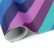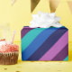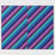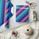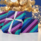 Eine Rolle Wickelpapier mit einem bunten Muster von diagonalen Streifen in cool aquamarin, ozeanblau, marineblau, pflaumenblau, lila und lavender.