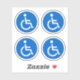 Runde Aufkleber mit dem klassischen mit Behinderung Symbol, ein Mann im Rollstuhl auf blauem Hintergrund. Blatt mit vier Aufklebern.