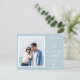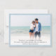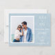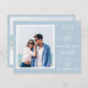 Modernes Foto von Ehepaar Wedding Save the Date Ankündigungskarte mit Website-Informationen, weißer Schriftart, blau strukturierte Cardstock Print Design.