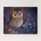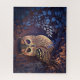 Dieses Kunstwerk zeigt eine blaue Eule auf einem blauen Hintergrund, im Stil von dunkelschwarz und hellgelb, handfarben, farbenfroh Geschichten erzählen, Siebdruck, Porzellan, lebendige Verwendung von Licht und Schatten, Märchen.