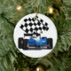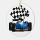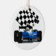 Blaues Rennfahrzeug mit Checkflagge Silbernes Ornament