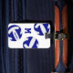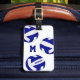 Dieser Beuteltaschen-Anhänger für Volleyball ist einfach mit drei zufällig angeordneten Volleybällen mit blauen und weißen Paneelen - personalisieren Sie den Spielernamen und das Monogramm auf der Vorderseite, Adressangaben auf der Rückseite - von katz_d_zynes