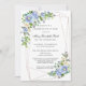 Airy und moderne blau-weiße Blumenmuster Design. Ein dünner geometrischer Rahmen aus Gold verleiht dieser Hochzeitseinladung seine Struktur. Zwei blaue Hydrangea- und Elfenbeinpeony-Arrangements befinden sich an zwei Ecken. Viel Grün, Blätter und Weinberge geben ihm ein modernes Boho-Ambiente.