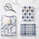 Diese koordinierende Zusammenstellung von Packpapierblättern weist drei unterschiedliche Muster mit einem blauen und grauen Farbmotiv auf: funky miteinander verflochtene Schleifen, Raute und kariertes Muster - von katz_d_zynes