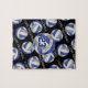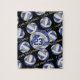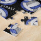 Dieses Volleyballmusterpuzzle für Mädchen enthält einen größeren blauen, grauen und weißen künstlerischen, stilisierten Volleyball, auf dem ihr Name und ihre Trikotnummer personalisiert werden können, der sich aus kleineren blauen, grauen und weißen Volleybällen auf schwarzem Hintergrund und "I Liebe Volleyball" in grauem Buchstaben zusammensetzt, die sich zwischen den verworrenen Reihen von Volleyballs erstrecken - Katz_d_zynes