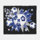Diese Sportfußballdecke für Jungen und Mädchen ist mit einer "Explosion" von blauen und weißen Fußballbällen in verschiedenen Größen und blauen und grauen Sternen im Comic-Stil auf einem individuell anpassbaren schwarzen Hintergrund ausgestattet - personalisieren Sie mit Monogramm- oder Varsity-Buchstaben und Jersey-Nummer - katz_d_zynes