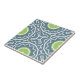 Ein faszinierendes zeitgenössisches Fliesendesign in der Keramik, das eine makellose Anordnung der geometrischen Formen in Grün und Weiß vor einem beruhigenden blauen Hintergrund zeigt.