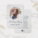 Schöne blau-rosa Gedächtniskarte/Beerdigungskarte mit einem Foto mit Aquarellblau und Rosa Rosen und Blume aus dem Atem des Babys vor einem silbernen Hintergrund.